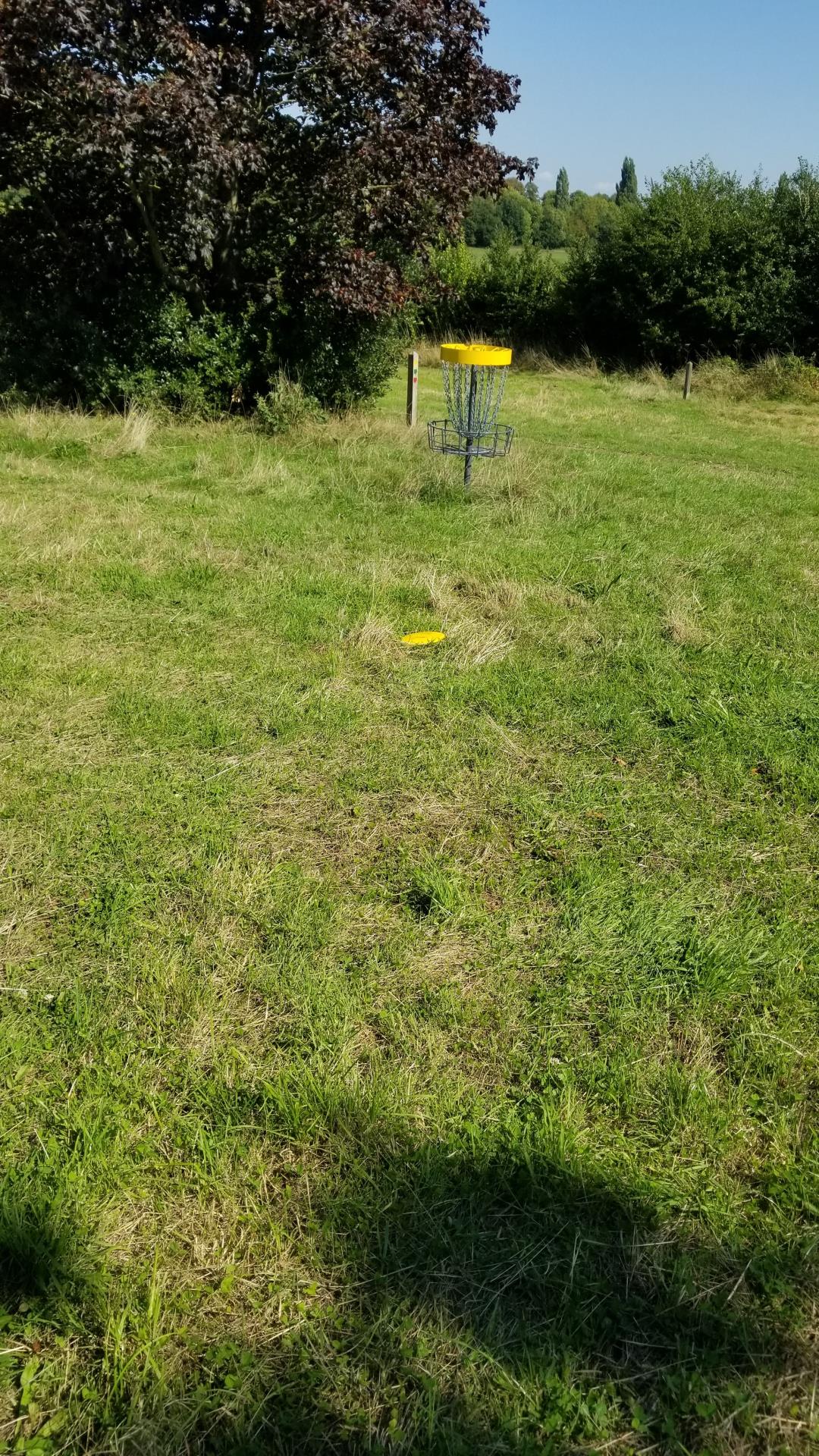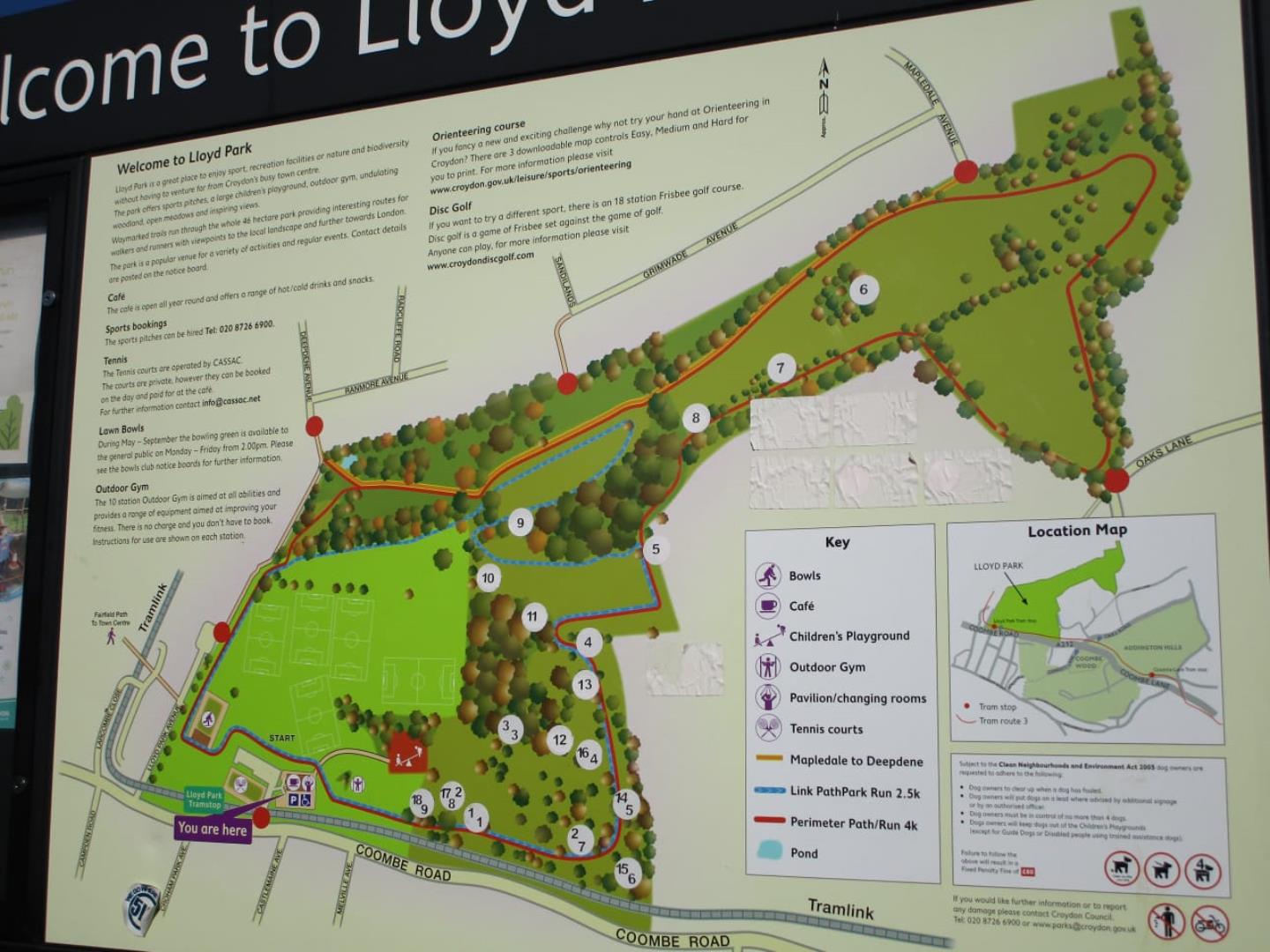 After breakfast and saying goodbye since the tour was over, we headed to the bus to Victoria Railway Station. We got on the train to East Croydon. A very pleasant ride. Once again, you can get just about anywhere on the transit system here. Out of the station the tram was there, and we took it to Lloyd Park for some disc golf. We went into the brown snack building, borrowed some discs, and headed out to the course. At the first tee, 3 locals were getting ready to tee off.