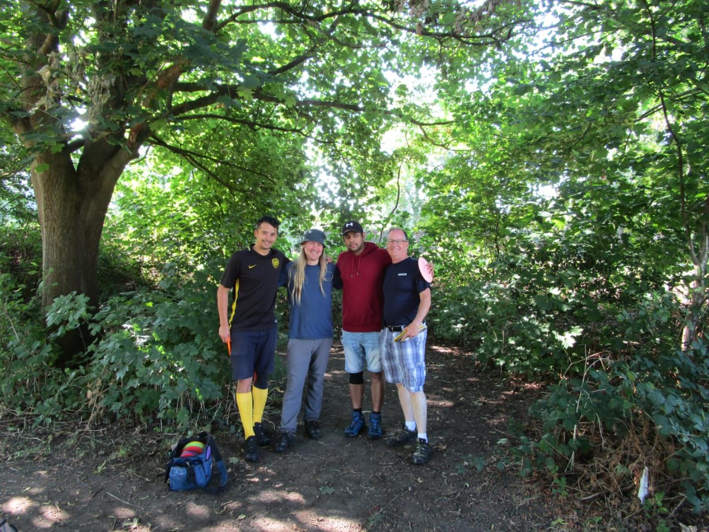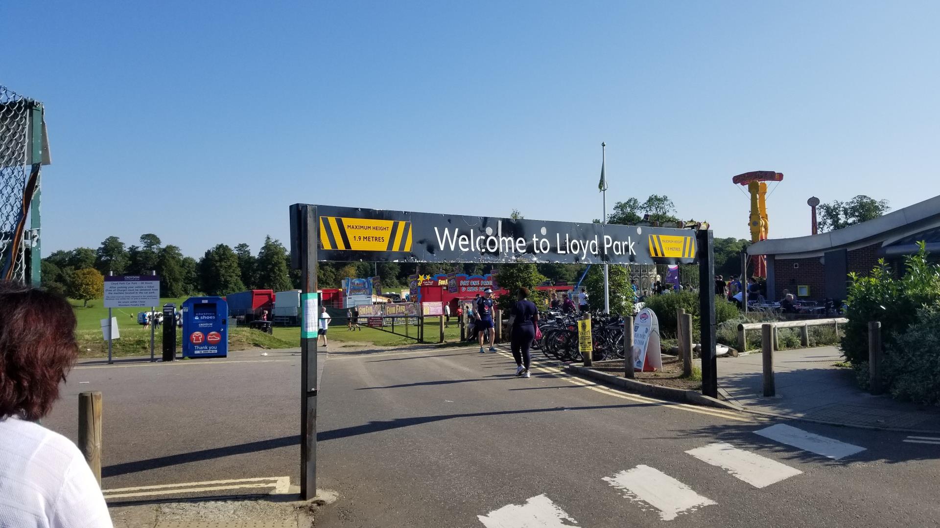 After breakfast and saying goodbye since the tour was over, we headed to the bus to Victoria Railway Station. We got on the train to East Croydon. A very pleasant ride. Once again, you can get just about anywhere on the transit system here. Out of the station the tram was there, and we took it to Lloyd Park for some disc golf. We went into the brown snack building, borrowed some discs, and headed out to the course. At the first tee, 3 locals were getting ready to tee off.